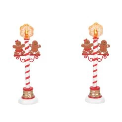 A pair of happy gingerbread figures dance atop these red and white striped street lamps. The lights are covered with LED snowflakes to make the season even brighter.