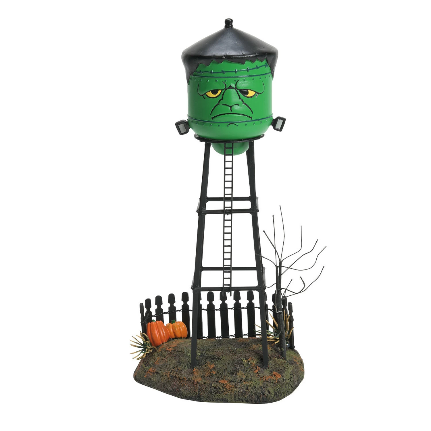 This Frankenstein water tower is a must have for any Halloween village! It features a tall water tower with a green monster face on the tank and bolts coming out of the side! The water tower is fenced in with wonky old fencing and a couple pumpkins grow at the base of the water tower! Introduced January 2021. Made by Department 56. Made of polystone. Dimensions: 11.42 in H x 3.93 in W x 5.51 in L. Item #: 6007706