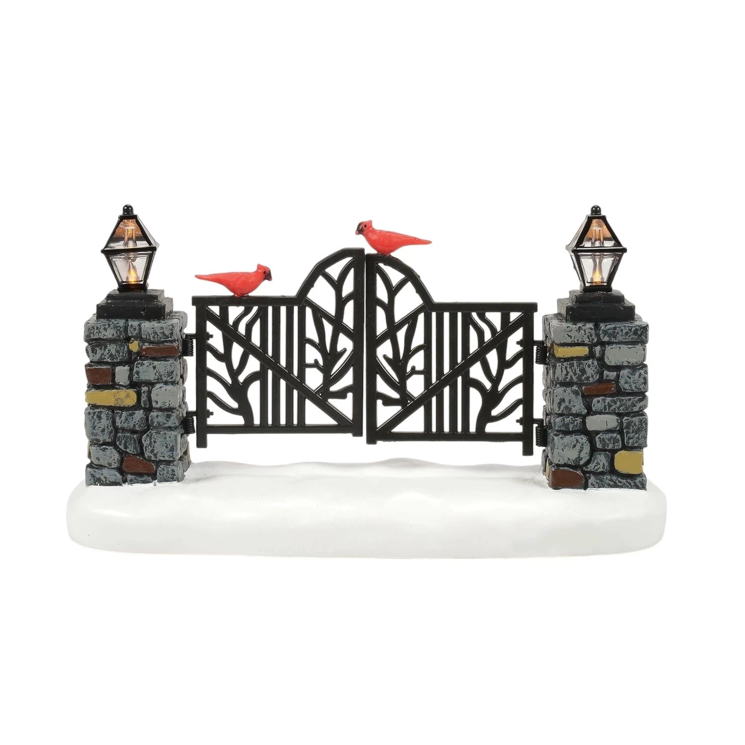 Open the door to charm and warmth with our enchanting “Cardinal Gate,” standing at just over 3 inches tall! This beautifully designed piece features an ornate gate flanked by sturdy stone pillars topped with glowing lanterns. The vibrant cardinals perched on the gate bring a delightful splash of color to your holiday village, embodying the spirit of joy and good fortune that accompanies new beginnings.