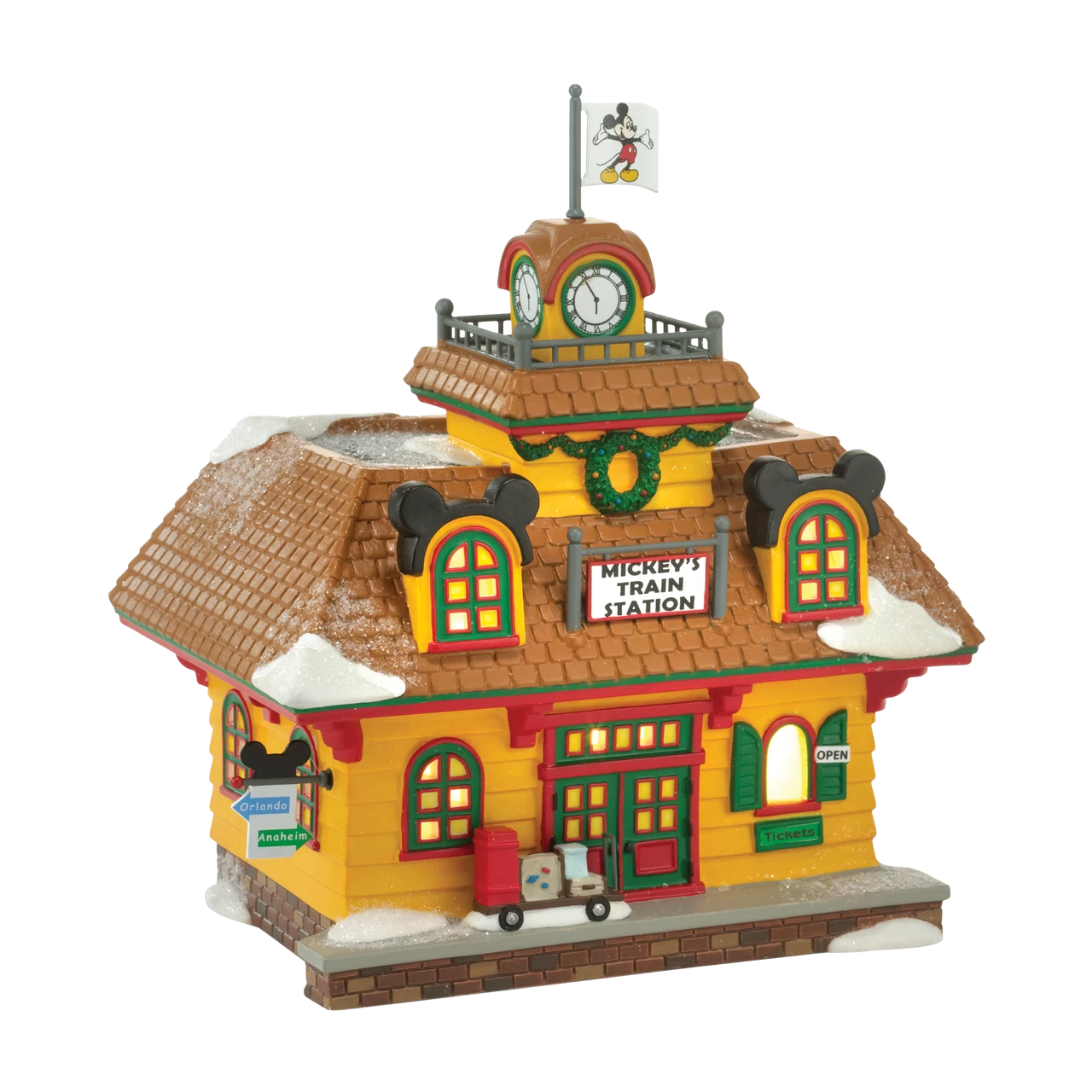 Mickey’s Christmas Village Series, by Department 56. Mickey’s Train Station, one of the charming, lit buildings from this series. This is a fun place to wait for the next train. Hand-crafted, hand-painted porcelain, includes light-cord with bulb.