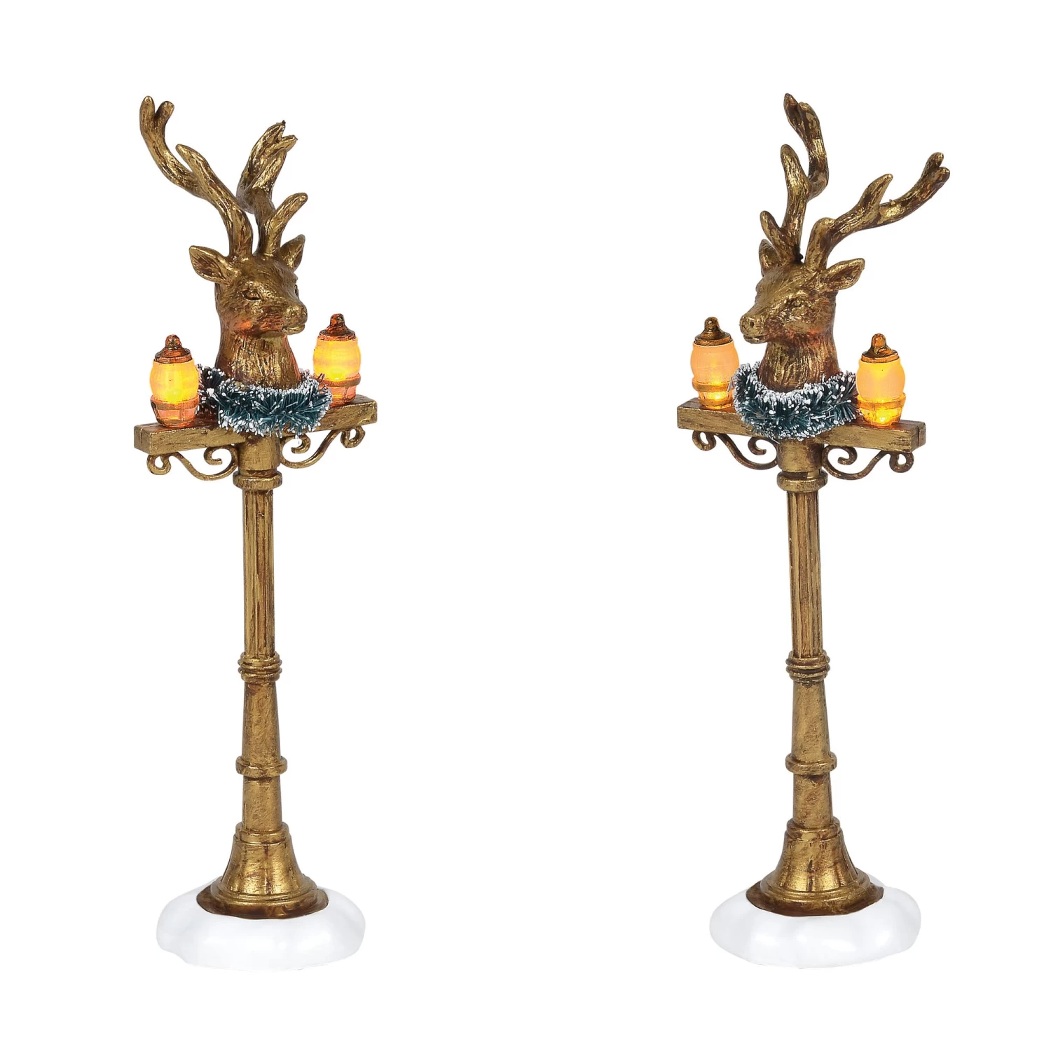 Set of 2 street lights for your Village display. Classic deer add a rustic charm. This lighted accessory is hand-crafted, hand-painted, resin. Battery box included, 2 C batteries required.