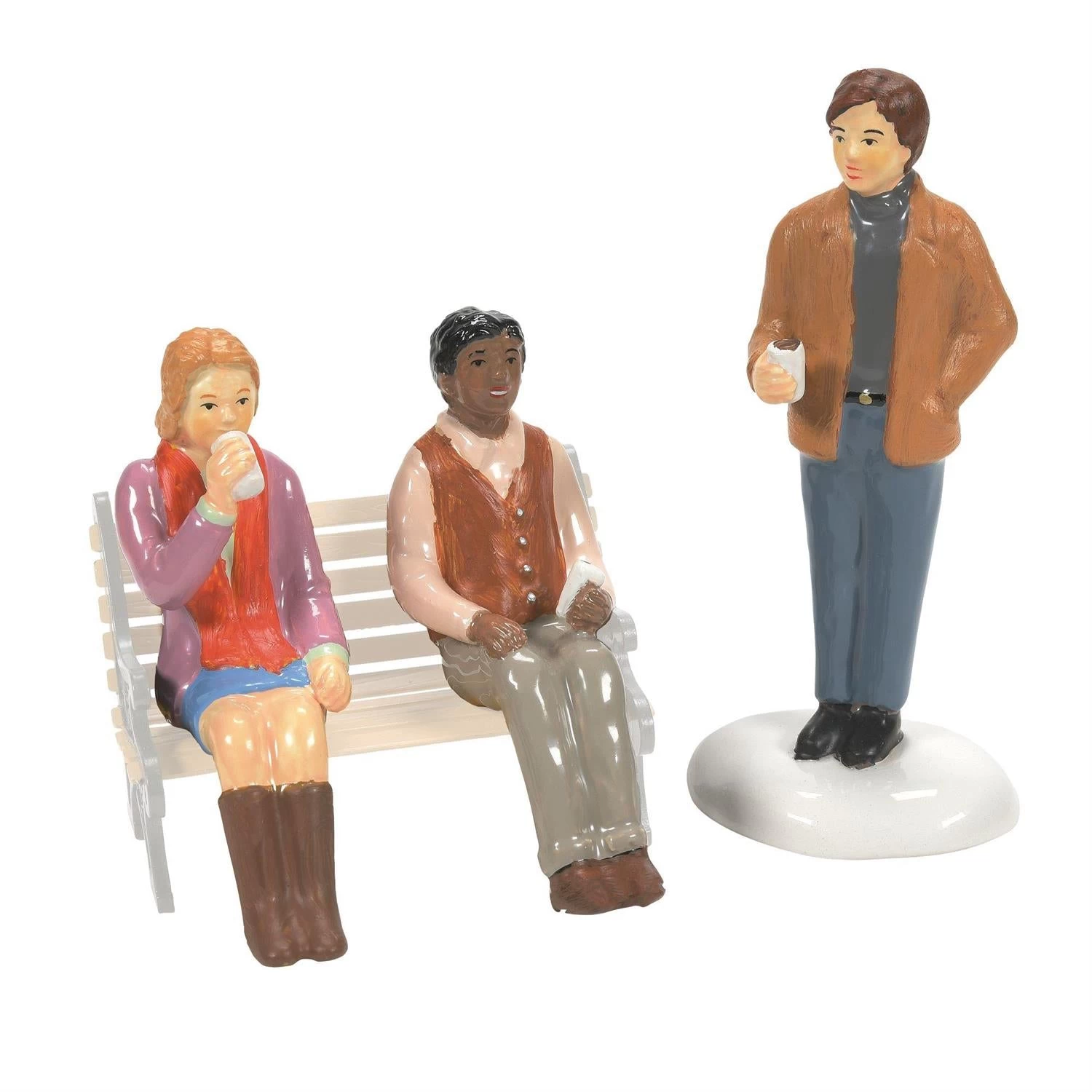 This set of three accessories shows two seated and one standing figure, all doing what today’s Village Hipsters do — drink coffee! The seated figures will go perfectly on any of the Department 56 park benches (sold separately).