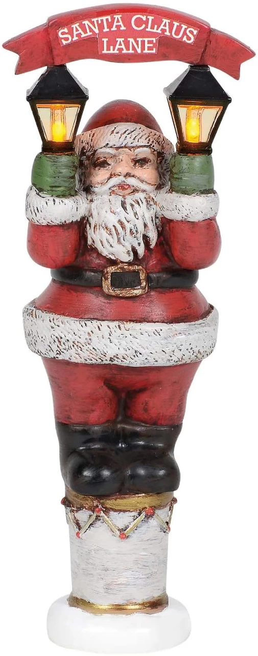 An old fashioned santa figure offers 2 street lights, welcoming visitors for Santa Claus Lane in your Village. This lighted accessory is hand-crafted, hand-painted, resin. Battery box included, 2 C batteries required.